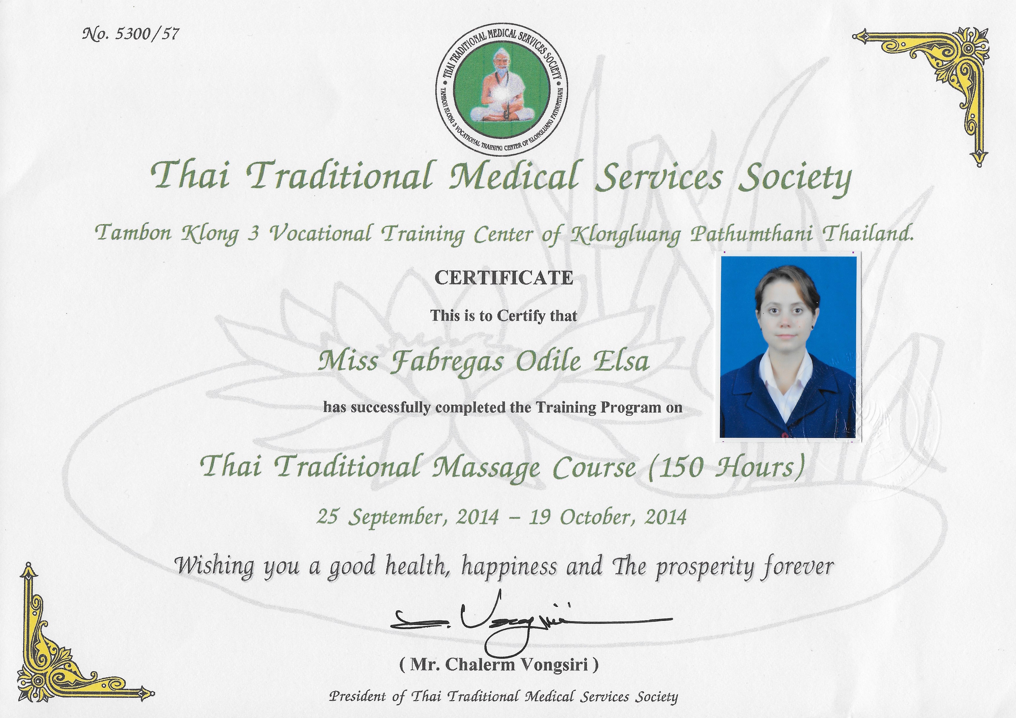 Formée par Miss Ketsanee Mukarasakul (Master en médecine thaïlandaise) en septembre 2014